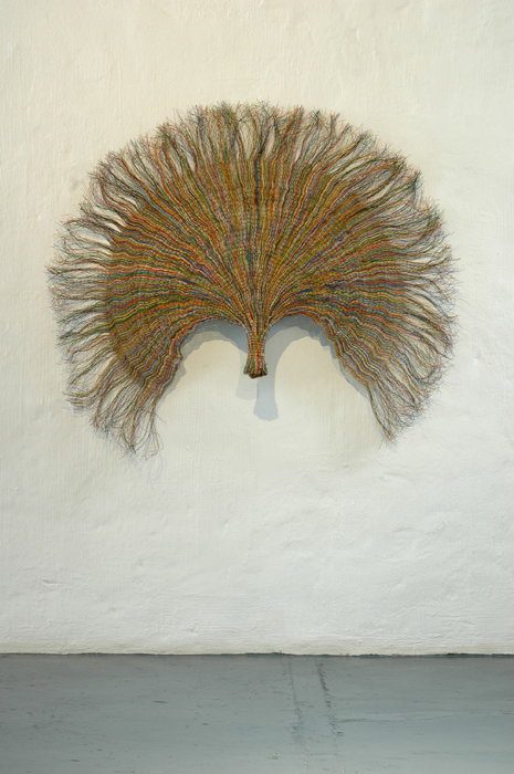 As in the previous work, I began with a bundle of several thousand lengths of wire and repeatedly halved the bundles, flattening the object and proceeding outwards until I was left with a fringe of single strands.