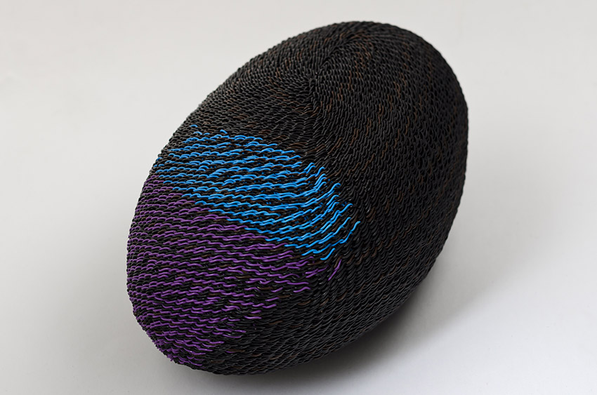 The changing tones of the wires map light’s passage across the surface of the form, analogous to the daily passage of light around our home planet.