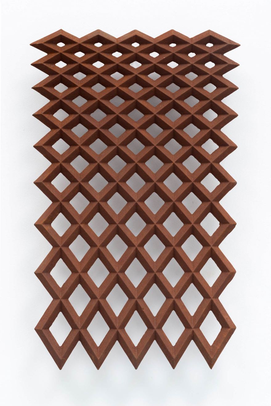 While suggesting a gently curving surface, this construction remains resolutely flat, but on a larger scale than the previous work, and in a material more associated with building vernacular.