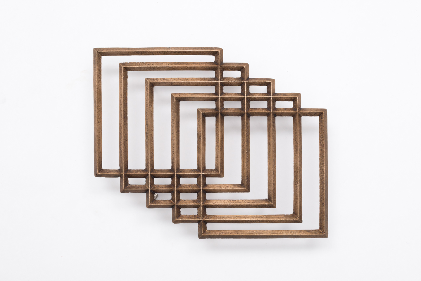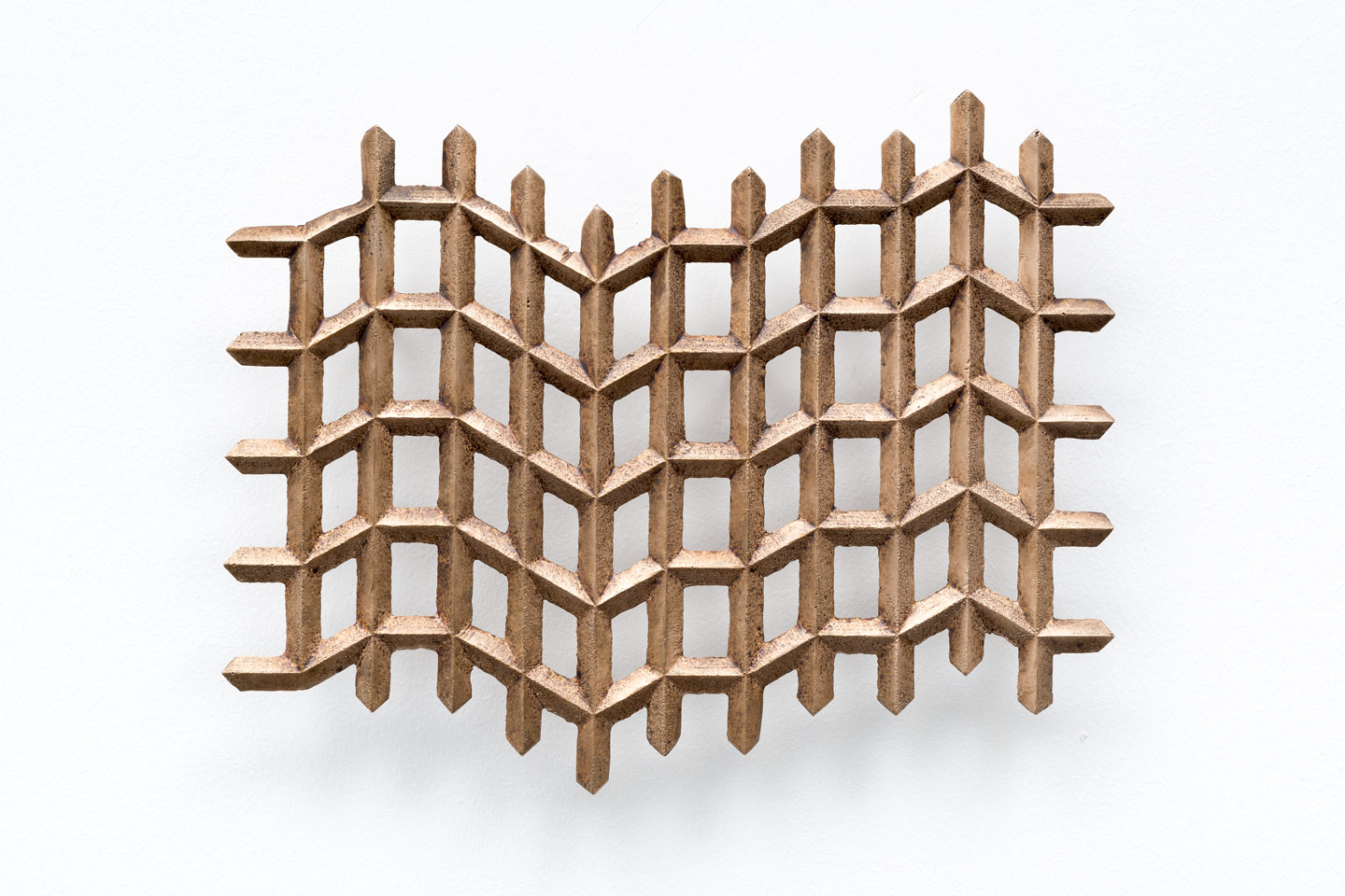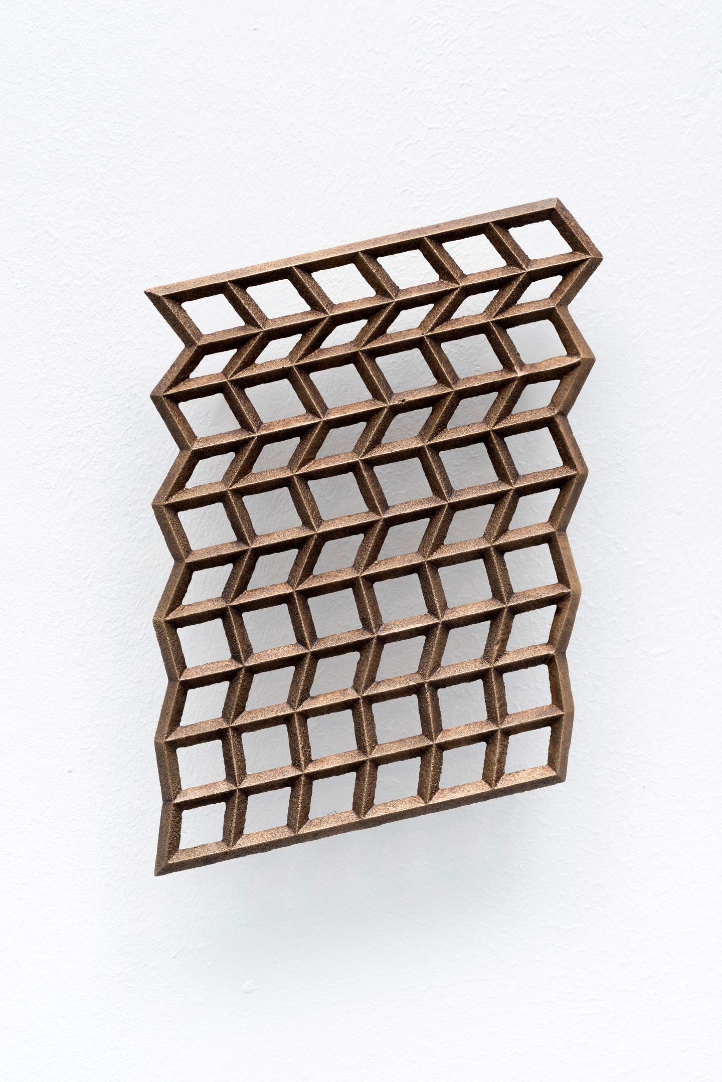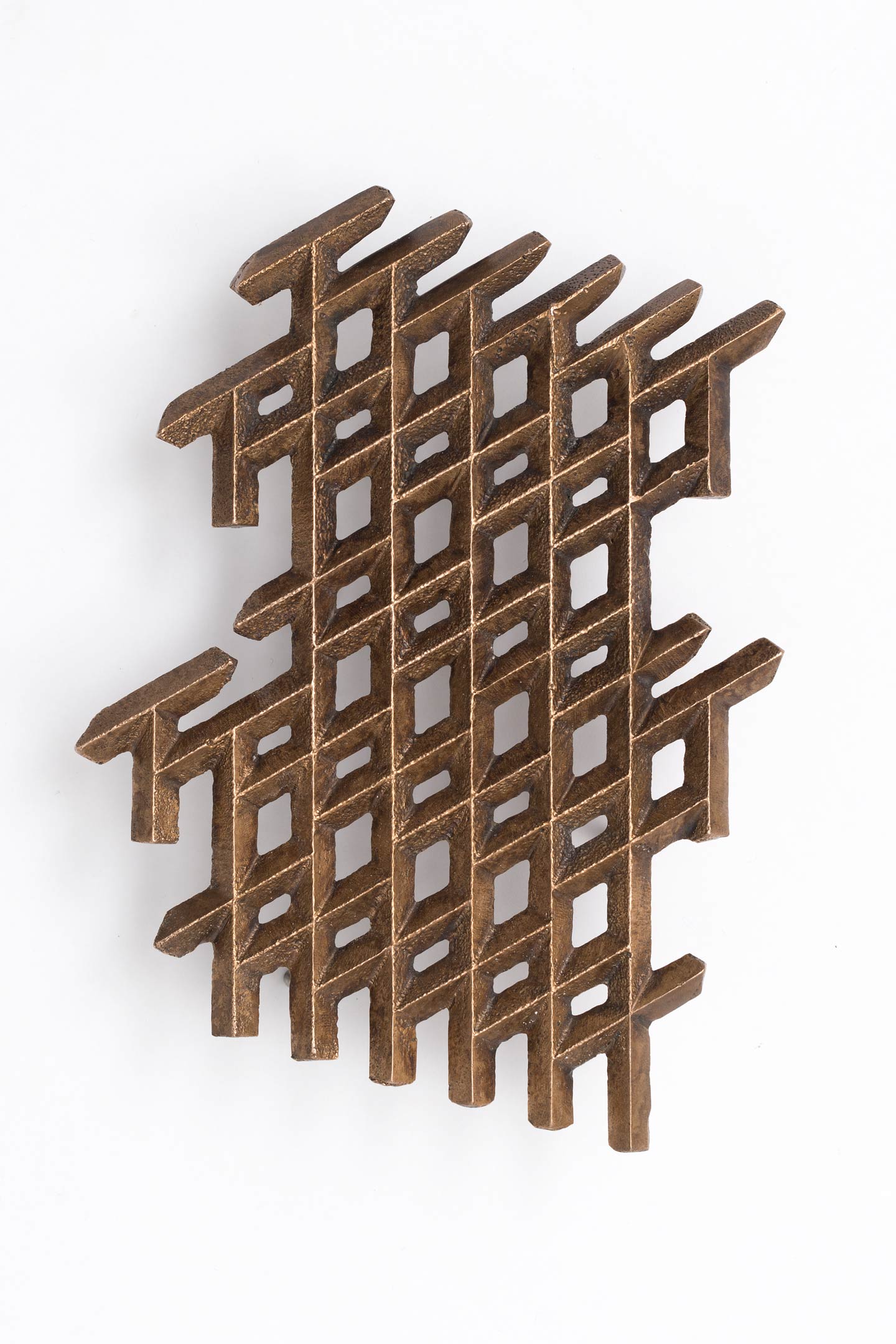 I began with a box of Foamcore scraps from studiomate Sue Williamson’s studio up the passage. Working with a cutting knife and hot glue, I soon developed a series of small, latticed structures, made from diamond-shaped sections of the material. The nature of these seemed to lend them to sand-casting in metal, and the constraints of that process bore further influence on the objects I went on to produce. A selection was cast in bronze, and one was enlarged to be produced in cast-iron.
